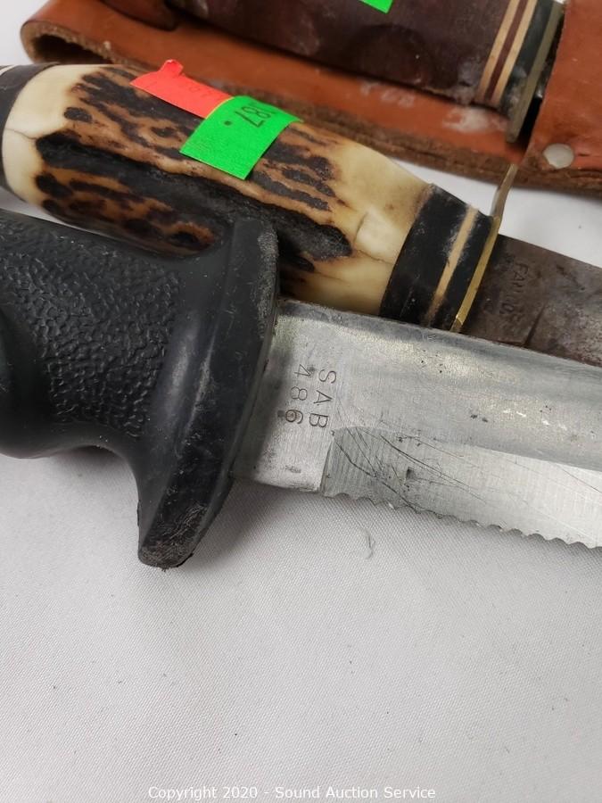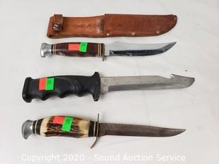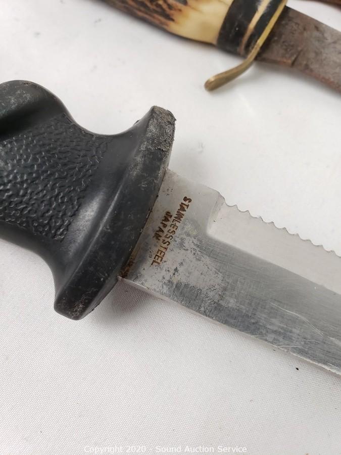 Lot Details: Includes Kabar, Banco and Japan Stainless. 9" to 10.5" long, 4.5" to 5.5" blades. Kabar comes with leather sheath.