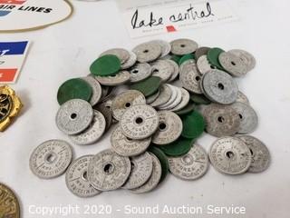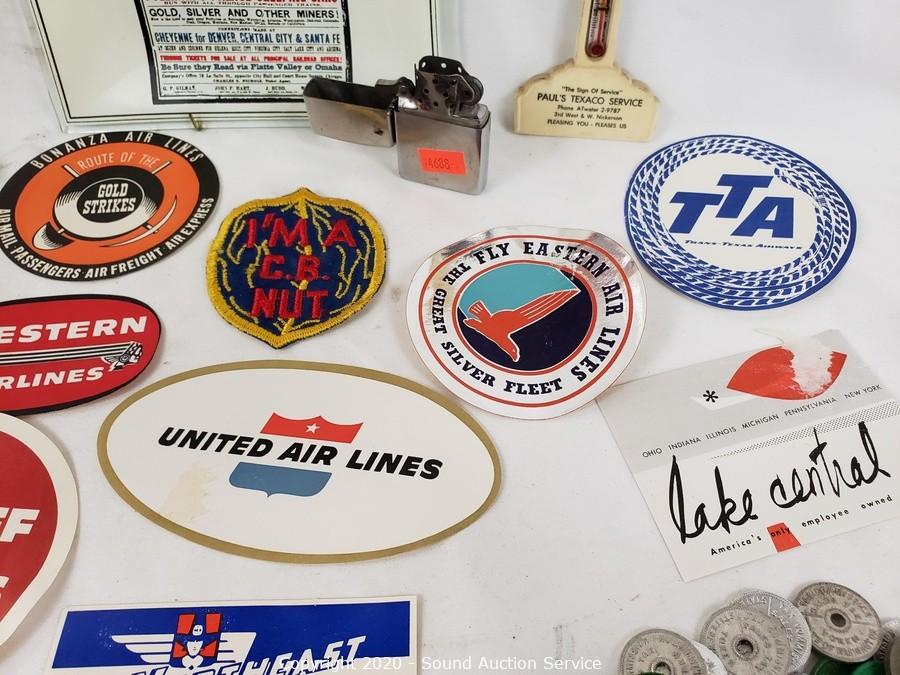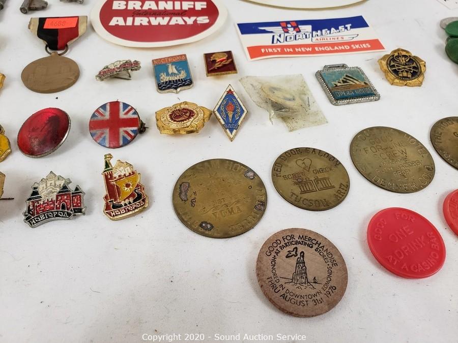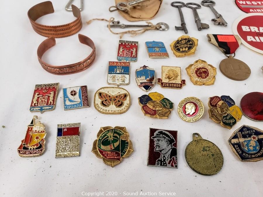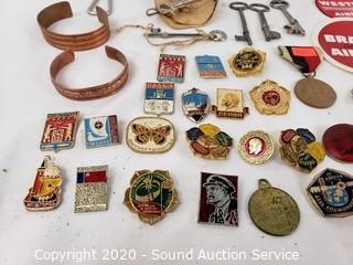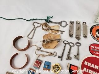 Lot Details: Includes Zippo lighter (c. 1937 to 1950), foreign pins, 1945 Army Occupation metal, copper baby bracelets, various tokens, skeleton keys and bottle openers.