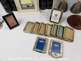 Lot Details: 20" Samovar, 11" x 19" x 7.5" photo album display (missing a knob), 2 reflective hanging decor, (12) 3.5" x 3.5" picture frames, candle snuffer and candle holders.