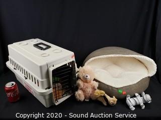 Lot #0326: Small Pet Bed, Carrier & Toys