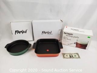 Lot #0252: 2 New Parini Baking Dishes & Pier 1 Dessert Set