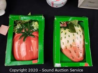Lot Details: Includes Hull pottery compote with lid (has a chip), strawberry and tomato wall decor, trinket boxes, coin bank and vase.