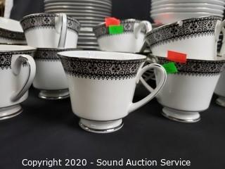 Lot Details: 12 pieces are cracked or chipped. Includes 2 dinner plates, 8 lunch plates, 12 snack plates, 5 berry bowls, 14 saucers, 12 cups, 12" and 16" platters, 10" oval server.