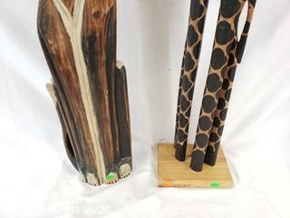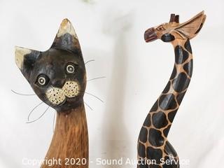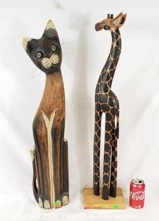 Lot #0295: Carved Wood Hand Painted Cat & Giraffe Sculptures