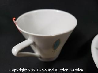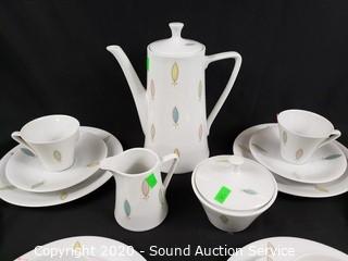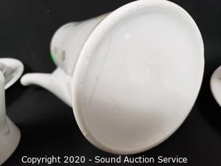 Lot Details: 3pc service for 6 with cream, sugar and teapot. 2 cups have small chips and teapot has a couple shallow cracks on the bottom.