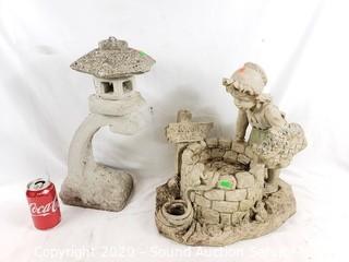 Lot Details: Includes concrete pagoda and wishing well composite statuary. 15" to 17" tall.