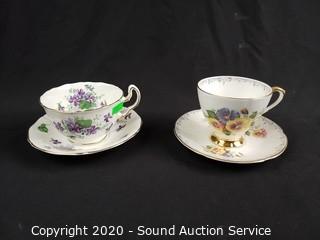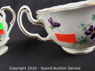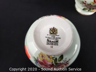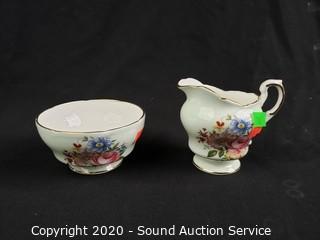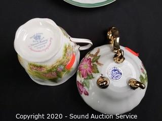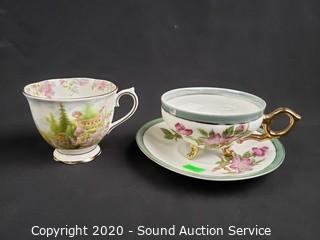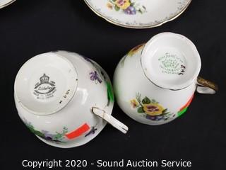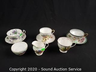 Lot Details: Paragon Majesty of the Queen Cream & Sugar England, Royal Albert Kentish Rookery England (no saucer), Taylor & Kent England, Adderley England (handle has been repaired, Fred Roberts Japan.