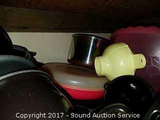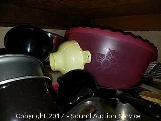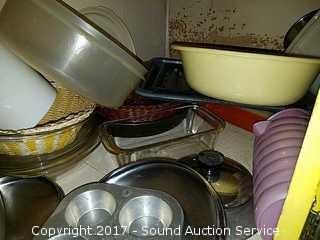 Pyrex casserole, T-Fal pans and lids, plastic bowls, funnels, revere ware, loaf pans, pie pans, and more.