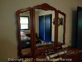 Tri-folding mirror. Approx. 31" tall, 69" wide and 19" deep. Mirror is 40" tall, 55" wide.