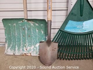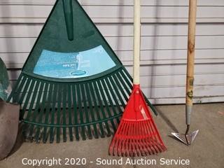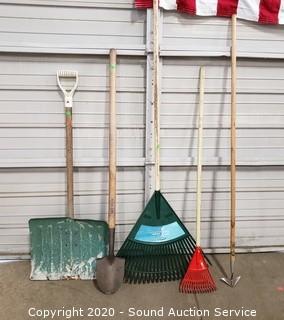 Lot Details: Leaf rakes, snow shovel, shovel, cultivator.