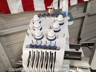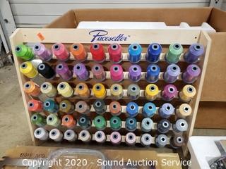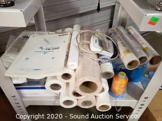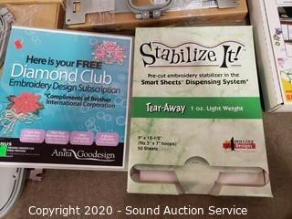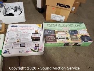 Lot Details: In excellent working condition. Comes with owners manual, thread, embroidery frames, various literature, embroidery designs, Floriani's embroidery kit and much more. Sits on a 36" x 23" x 21" cart.