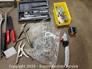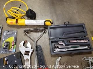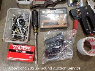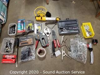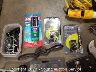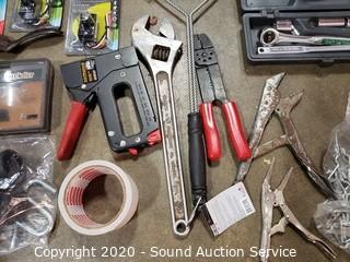 Lot Details: Peg hooks, adjustable wrenches, stapler, work light, wire brush & more.
