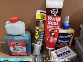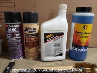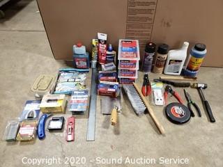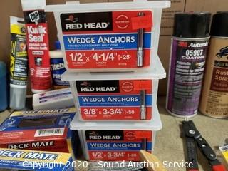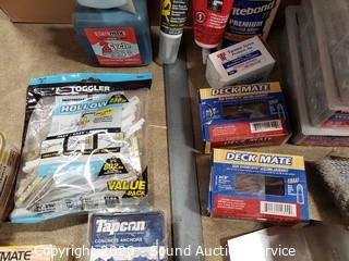 Lot Details: Includes pneumatic oil, wedge anchors, 50ft tape, brushes, wood glue and more.