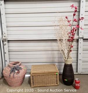 Lot #0051: Woven Chest, Vases & Branch Decor