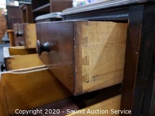 Lot Details: Wood casters, 3 drawers, dovetail joinery, some damage to the veneer on top, refer to photos for condition. 32" x 14" x 18".
