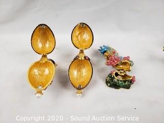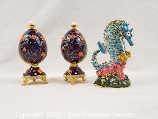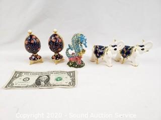Lot Details: 2 elephants, Faberge egg, seahorse. Approx. 2.5" - 3.5" tall.