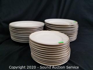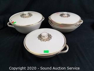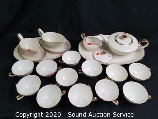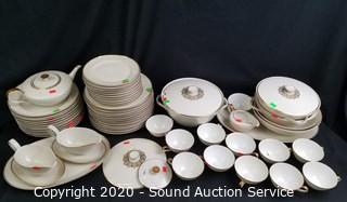 Lot Details: Gold trim. Includes 12 dinner plates, 12 bowls, 11 lunch plates, 12 cups, 2 gravy boats, creamer, 13" and 14" platters, (2) 8" covered serving bowls, 9" covered serving bowl, 8" and 9" serving dishes and teapot. Also comes with a sugar lid.