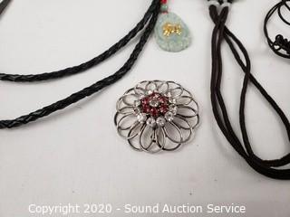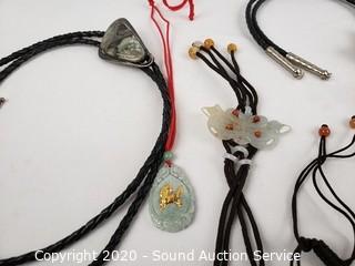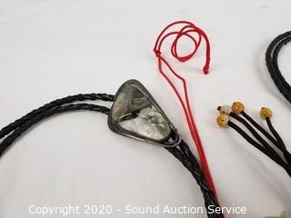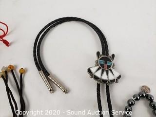 Lot Details: Jade necklaces and stone inlay bolo. TW of sterling 98.6 grams, some stone weight.