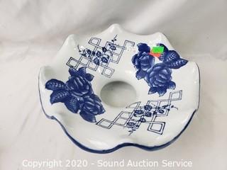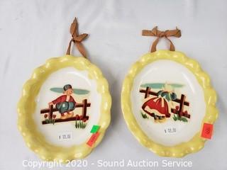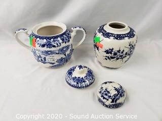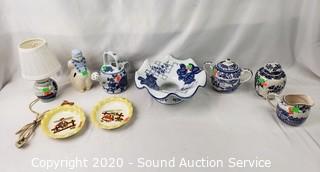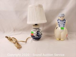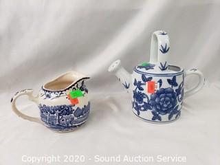 Lot Details: Includes scalloped edge signed "Walker" wall hangings, watering can, table lamp, cream, sugar, planter and urn.