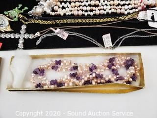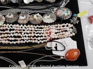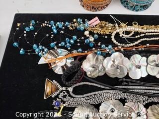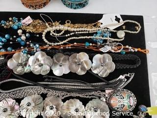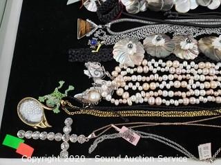 Lot Details: Most ready for resell, already priced. Necklaces, bracelets, compacts, hair pin, stone, pearl, rhinestone, shell. Necklace display IS included, 12" x 15".