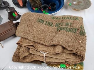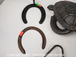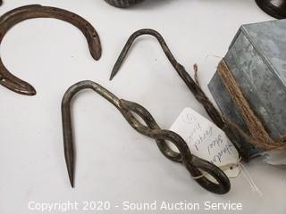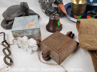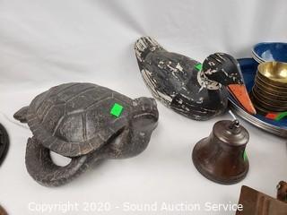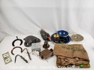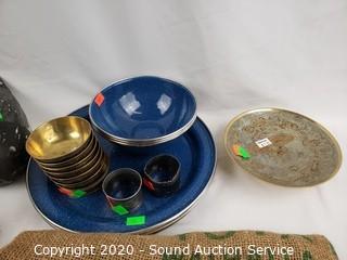 Lot Details: Includes rustic hooks, enamelware plates, brass Asian bowls, napkin rings, turtle and duck figures, burlap bags