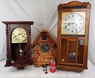 Lot Details: Includes Wentworth 31-Day, Kona quartz cuckoo clock and other. Largest is 28" x 12" x 5"