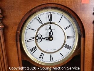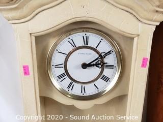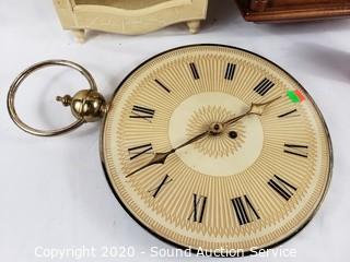 Lot Details: Howard Miller Quartz pendulum clock, 24" H x 12" W x 4" D, works. Ethan Allen quartz clock (NO pendulum), movement is ticking, 23" H x 10" W x 4" D. Vtg. Wind Up (NO key) pocket watch style wall clock, works, 18" H x 13" D.