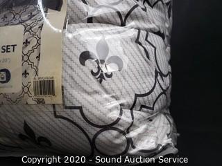 Lot Details: Includes 86" x 86" comforter and (2) 26" x 20" shams. Fleur-de-Lis print. Comforter has a stain/dirty spot, appears the label had gotten wet and bled onto the blanket. May wash out. Otherwise like new.