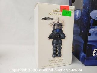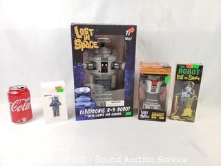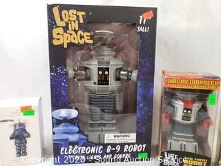 Lot Details: Includes Robby the Robot Hallmark ornament, All plastic assembly set, Wacky Wobbler bobble head and 11" Electronic B-9 Robot with lights and sounds. All are in original packages.