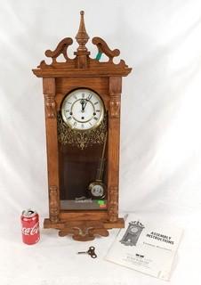 Lot Details: Piece that attaches the pendulum to the gears has come free, otherwise appears to be in working condition. Comes with key & manual. 31" H x 12" W x 6" D.