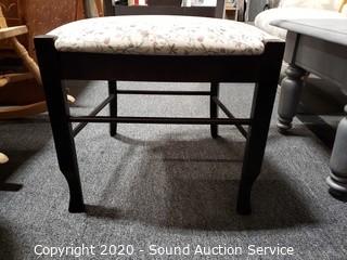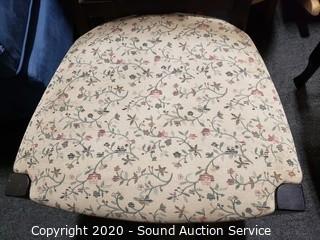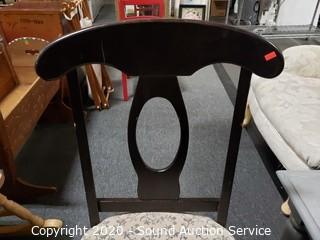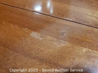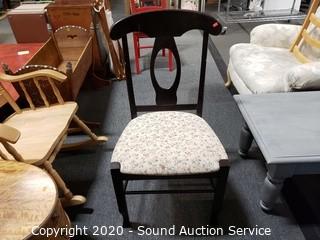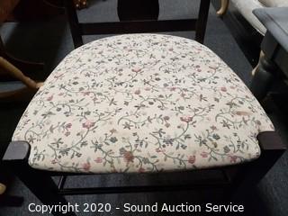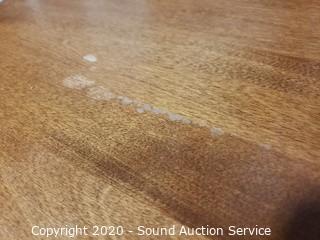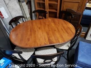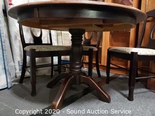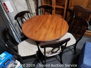 Lot Details: Solid wood construction, dark stain finish, 6 chairs, a few have a stain on the seat, refer to photos. 36" x 46" diameter.