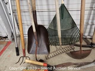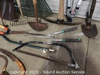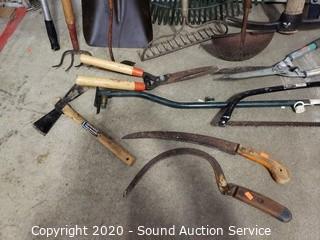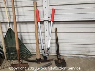 Lot Details: Brush rake, loppers, leaf rake, shovel, pickaxe, pruners and more.