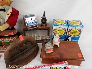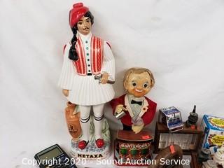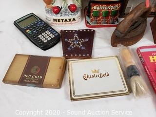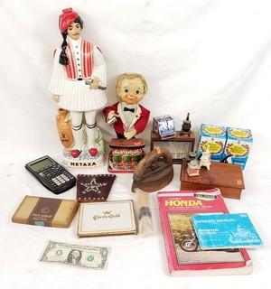 Lot Details: Includes Metaxa decanter figure, assorted coin banks, cigarette and cigar boxes, tin coin bank, tin toy bartender, die cast stove salt and pepper shakers, sad iron, leather cuff bracelet, Texas Instruments calculator and more.