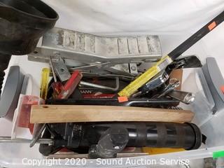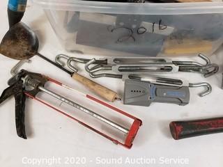 Lot Details: Includes lever jacks, turnbuckles, pry bar, grease gun, ear plugs, screwdrivers, hammer, stud sensor, scraper and more.