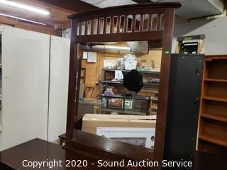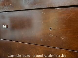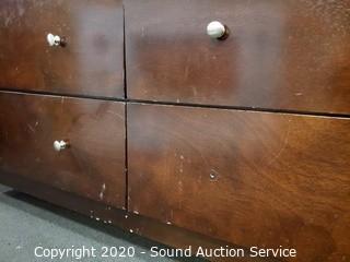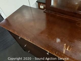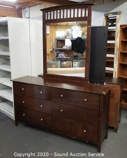 Lot Details: Various wear to the finish, 2 drawers are missing a pull, refer to photos. 34.5" x 63.5" x 17.5" with 46" x 35" mirror.