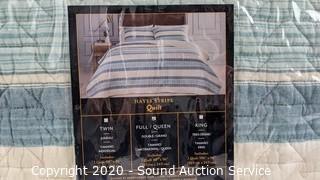 Lot Details: Includes quilted comforter and 2 standard shams. White and blue striped.