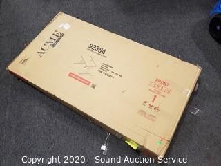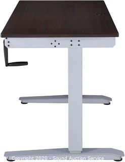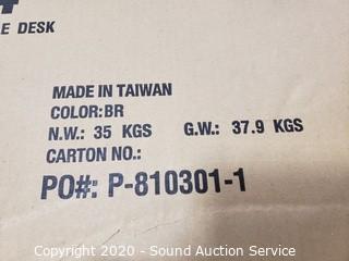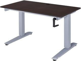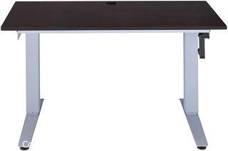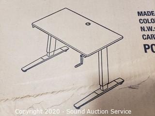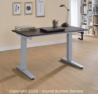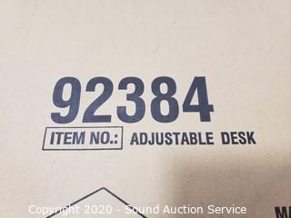 Lot Details: Unassembled in original box, opened to verify contents. Complete. Handle lift, adjustable Height, "T" metal base, Wooden table Top, Silver powder coating metal tube. Assembled 48"H x 24"D x 47" W. Item #92384.