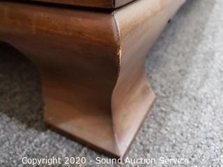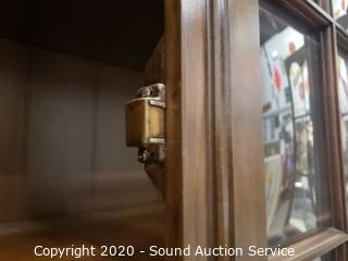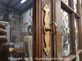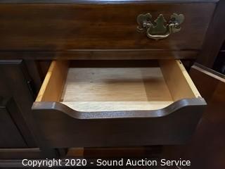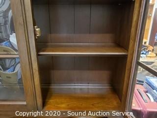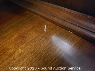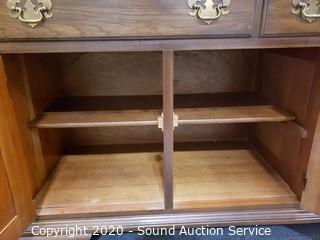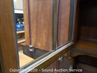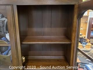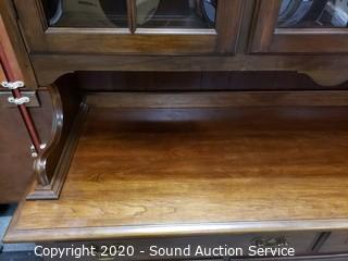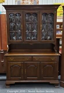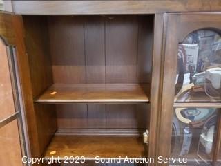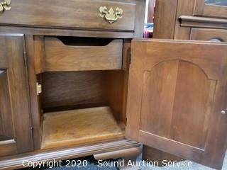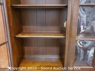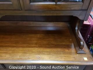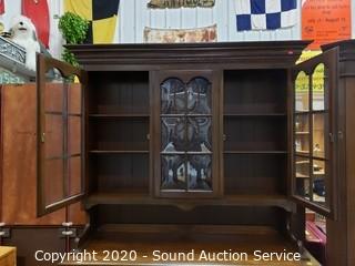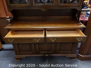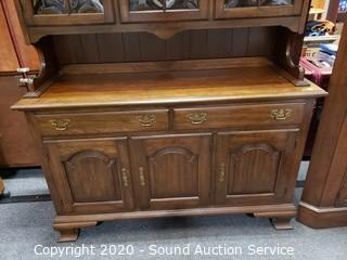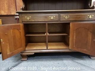 Lot Details: Has some minor wear, refer to photos, otherwise in great condition. Dark finish, upper portion has 3 adjustable shelves with plate grooves, lower has 2 drawers and 2 lower cabinets. Overall 80" x 54" x 19".