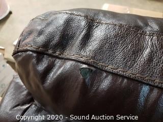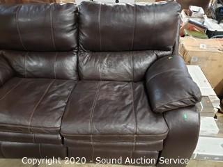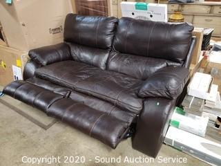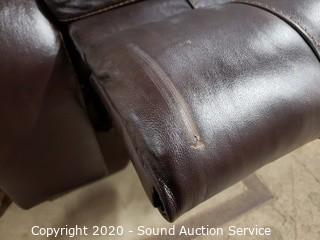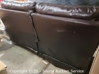 Lot Details: 36" H x 69" W x 20" to seat. Scuff on bottom left foot rest, left side reclines but the handle needs to be pulled while manually lifting foot rest, back has multiple holes, refer to photos.