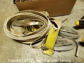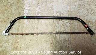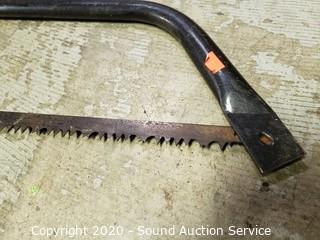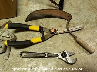 Lot Details: 32" bow saw, ratchet straps, wrenches, bar clamp, hand scythe, trimmer and more.