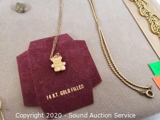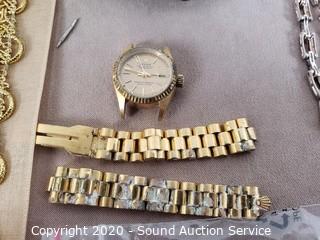 Lot Details: The Rolex band is not attached, is a Oyster Perpetual Date Just, Gold filled bear pendant necklace, pyrite, ring, bracelet & more. Tray NOT included.