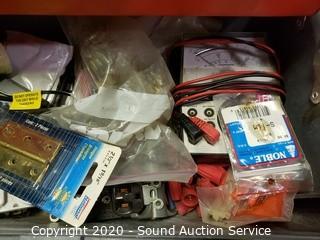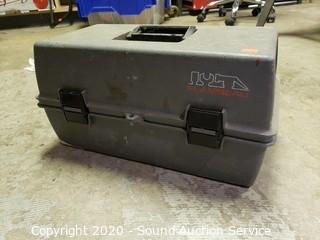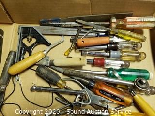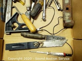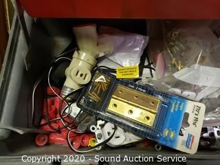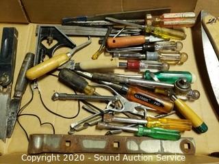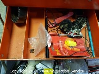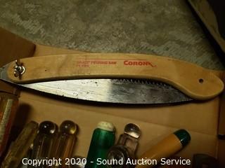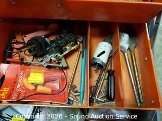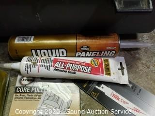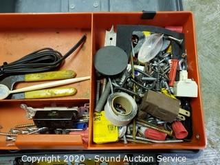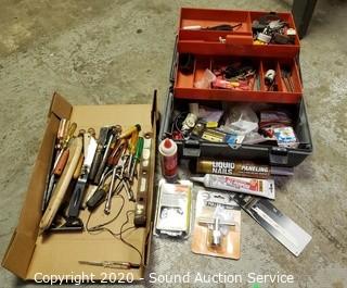 Lot Details: Includes rasps, files, screwdrivers, adhesives, various hardware, wire connectors, saw and more. Tool box is 9" x 17" x 9".