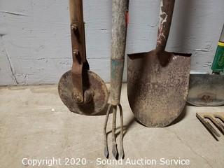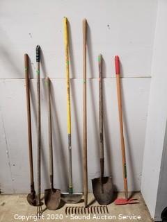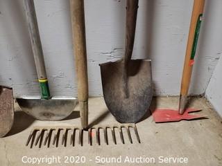 Lot Details: Hoe, brush rake, edger, shovels, cultivator.