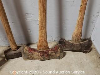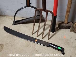 Lot Details: 2 double bit splitting mauls, scythe, tree limber, sledgehammer, potato fork, machete, pruners.