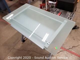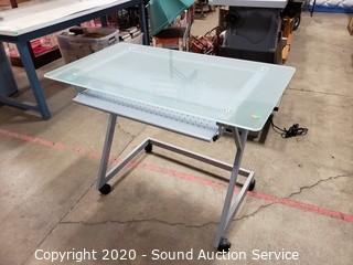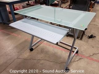 Lot #0332: Modern Glass Top Rolling Steel Computer Desk