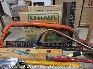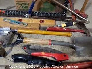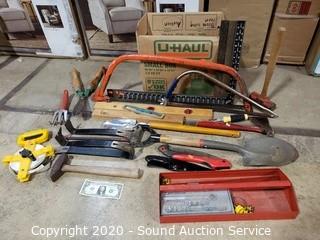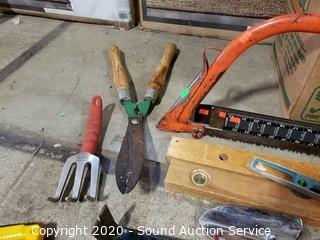 Lot Details: Includes levels, bow saw, pry bars, hatchet, mallet, gardening shovels, carpenter's squares and more.