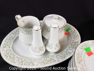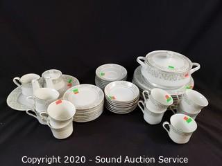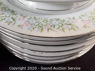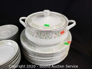 Lot Details: Creamer & 1 tea cup have a tiny chip on the rim. Some of the silver trim is fading on a few pieces. 8 dinner plates, 8 snack plates, (8) 5.5" berry bowls, 9 cups, 8 saucers, cream, sugar, salt, pepper, 8" covered server, 12" platter.
