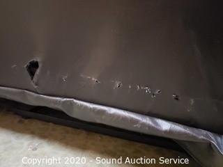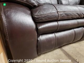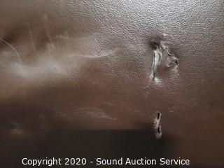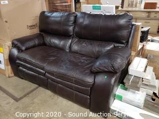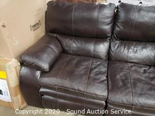 Lot Details: 36" H x 69" W x 20" to seat. Scuff on bottom left foot rest, left side reclines but the handle needs to be pulled while manually lifting foot rest, back has multiple holes, refer to photos.