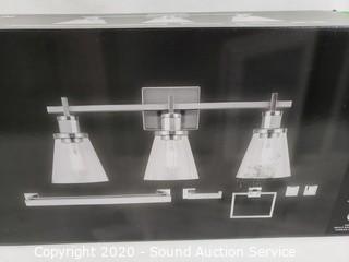 Lot Details: Satin nickel finish, includes 24" LED vanity light bar 5W, 400lm, 4000k color, towel bar, toilet paper holder, towel ring & 2 robe hooks.