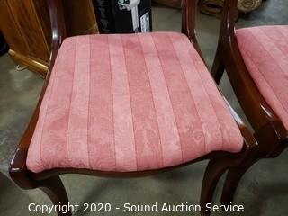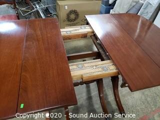 Lot Details: Chairs are by "The Georgetown Galleries", upholstery matches the love seat in the next lot. In excellent condition. 30" H x 40" W x 25" - 95" L. 2 17" drop leaves & 3 12" leaf inserts.
